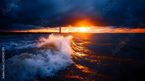 Dramatic Ocean Sunset with Lighthouse and Wave