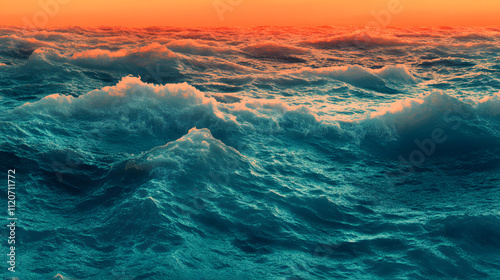 Dramatic ocean waves at sunset. Teal and orange hues dominate the scene, showcasing the power and beauty of the sea. A breathtaking seascape.