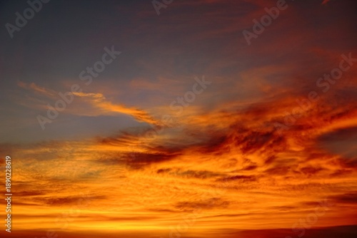 Dramatic orange and dark blue sunset sky with textured wispy clouds.