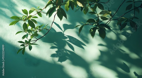 Dramatic shadows of green leaves cast on turquoise wall in sunlight creating natural abstract pattern with soft light and dark contrasts. Minimalist spring decor.