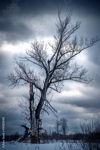 Dramatic sky over old lonely tree in winter time. Vertical view.