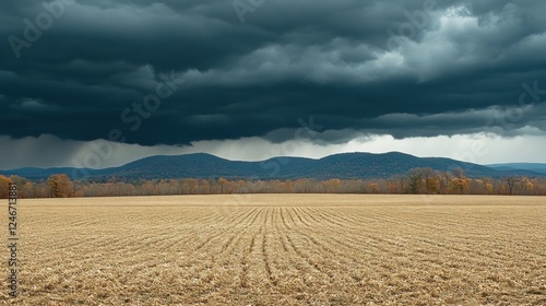 Dramatic Sky Over Wheat Field with Mountains in Background