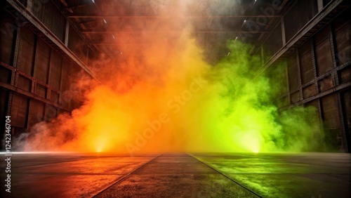 Dramatic Smoke Effect in Industrial Space with Vibrant Orange and Green Colors