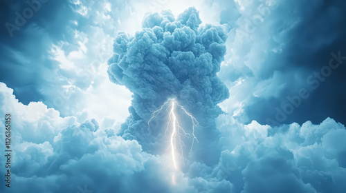 Dramatic storm clouds with lightning striking through sky, creating powerful and intense atmosphere. scene captures raw energy of nature in captivating display