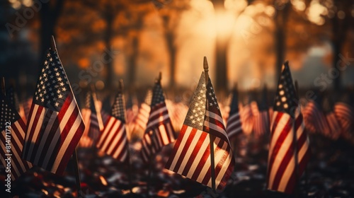 Dramatic Sunlight Shining Through a Field of American Flags at Dusk