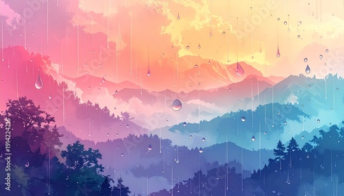 Dramatic sunrise over misty mountain forest with pink clouds and birds flying