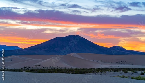 Dramatic sunset over sand dunes and a dark mountain peak, creating a serene desert landscape