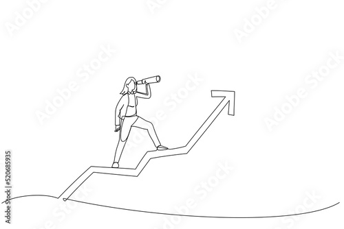 Drawing of businesswoman team manager using telescope to see future standing on top of rising arrow market graph. Investor fortune or profit growth. Single line art style