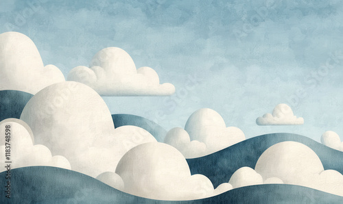 Dreamy Blue and White Cloudscape Illustration with Gentle Hills