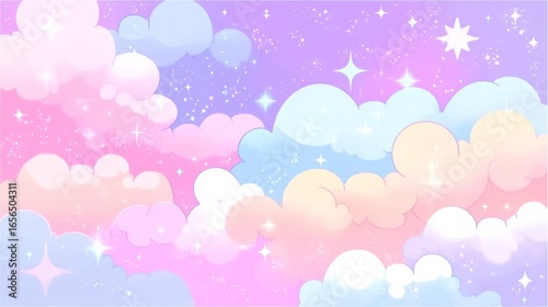 Dreamy clouds in pink, beige, and blue against a starry sky with sparkles, creating a whimsical and magical atmosphere.