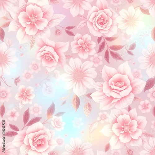 Dreamy Floral Pattern: A delicate and whimsical seamless pattern featuring blush pink roses, dainty blossoms, and a soft, iridescent background.