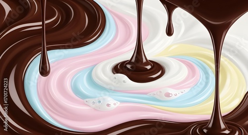 Dreamy Fluid Abstract Art of Swirling Chocolate and Yoghurt in Pastel Waves