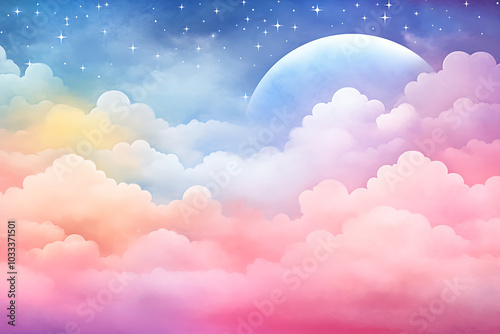 Dreamy pastel clouds and serene moon in colorful sky evoke tranquility