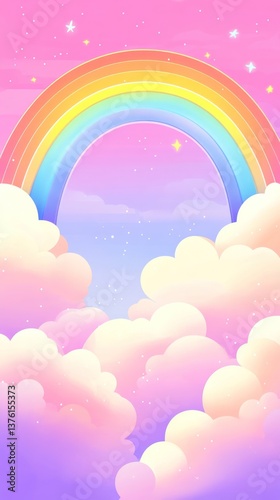 Dreamy pastel sky with rainbow arch and fluffy clouds illustration