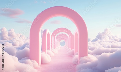 Dreamy pink arches in fluffy clouds creating a surreal pathway to the sky, evoking a sense of wonder and tranquility