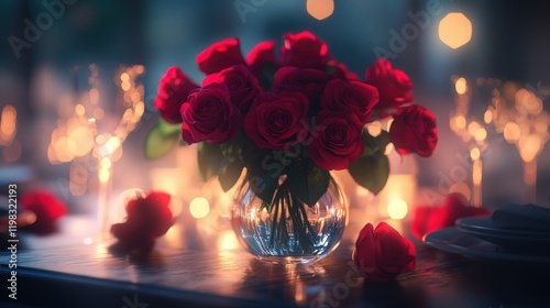 dreamy scene with a bouquet of red roses in a glass vase, glowing softly in the light, perfect for a Valentine Day dinner setting