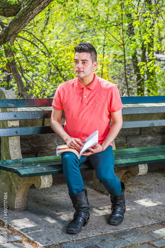 Dressing in a red Polo shirt, green pants and long leather boots, a young handsome guy is sitting on a long chair in the morning of a spring season, reading a book.