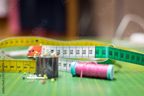 Dressmaker workshop: Close up of measuring tape, needles and thread