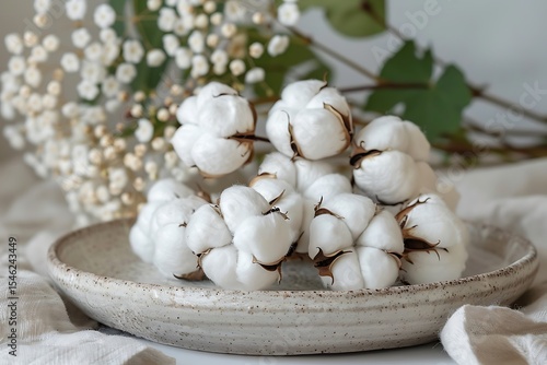 Dried cotton flower display on rustic plate high resolution picture