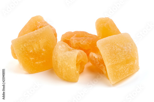 Dried melon slices, close-up, isolated on white background