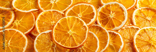 Dried orange chips. Christmas banner. Heap of dehydrated fruit slices as background. Healthy snack. Top view.