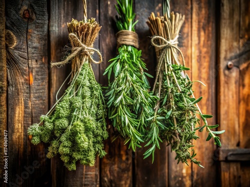 Dried rosemary and thyme bundle hangs, rustic kitchen charm captured in stylish photography.