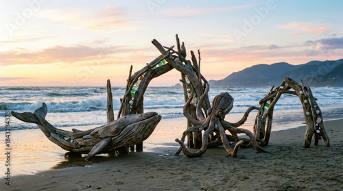 Driftwood whale and octopus sculpture on sandy beach at sunset with ocean waves and distant cliffs, evocative coastal art installation and serene golden light