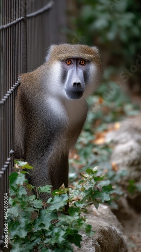 Drill Monkey Leaning Against Fence Looking at Camera in Outdoor Habitat