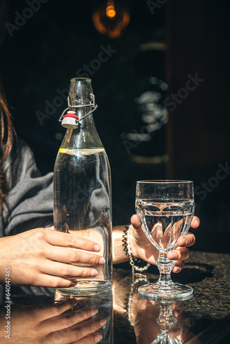 Drink water bottle with glass on table in the restaurant.