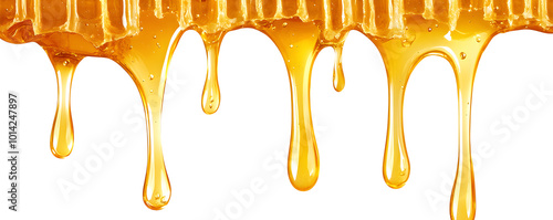 Dripping golden sweet honey flowing down the frame from the top over white and transparent background. PNG