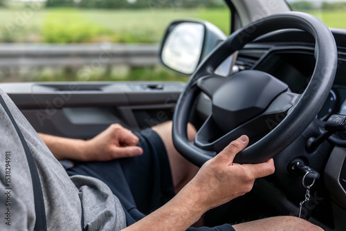 Driver hands on steering wheel. Inside car driving. Road control on highway.