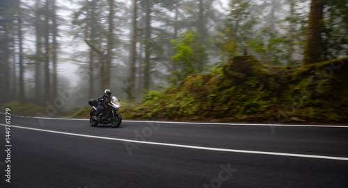 Driver riding motorcycle on empty road , foggy rainforest, spring mountains