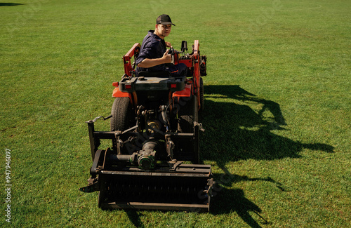 Driving, looks behind, shows thumb up. Man is with utility tractor with grass cutter and aerator equipment on the field