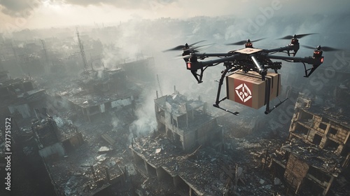 Drone Delivering Humanitarian Aid Box Over Disaster Area for Relief Operation