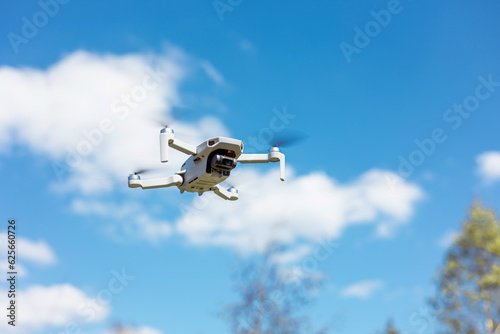 drone flying in silhouette against the blue sky, copter on a blurred background in the sunlight, slow motion