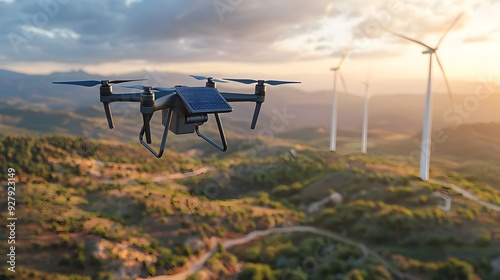 Drone flying over wind turbines in a scenic landscape.