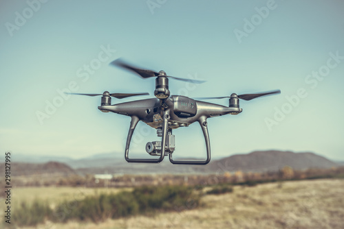 Drone in flight in the countryside. Drone in the air.