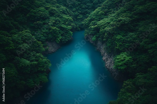 Drone view of a crater lake with deep blue waters and surrounding greenery