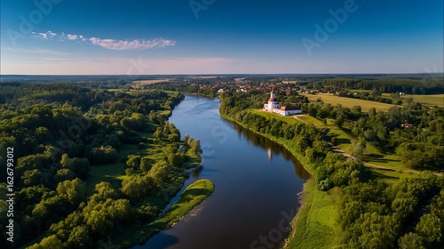 Drone View of Nemunas River Bend near Vilkija Church, Lithuania .