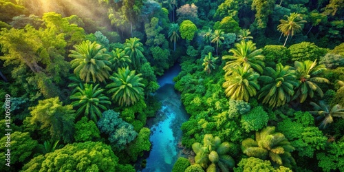 Drone View Tropical Paradise: Lush Blue-Green Summer Leaves, Serenity Nature Background