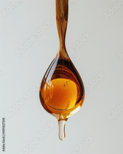 Droplet of honey dripping from wooden dipper white background closeup photography studio environment ultra-detailed texture for culinary enthusiasts