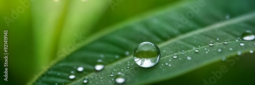 droplet of water resting on a leaf, with droplets spreading outwards from the central droplet.