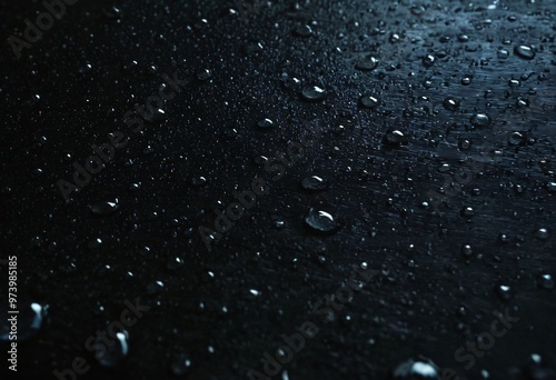 Drops of water on a black surface. The condensate. Top view. Free space. Ai generated image