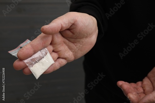 Drug addiction. Man with plastic bag of cocaine on grey background, closeup