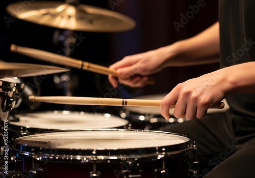 Drummer rhythmically playing drums in dim lighting and a focused scene