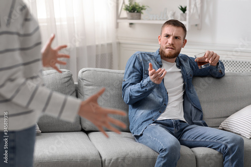 Drunk man arguing with his wife, drinking whiskey at daytime