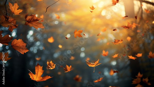 dry autumn falling leaves autumn park background, selective focus blurred forest background fall