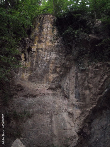 Dry from the summer heat forest waterfall. Dark rocks hang sheer between the lush forest.