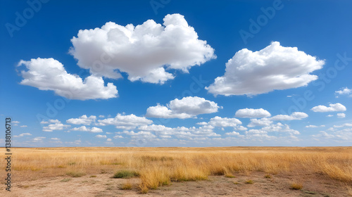 Dry grass field under bright blue sky with scattered fluffy white clouds. Copy space