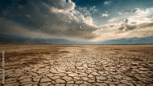 Dry Riverbed with Cracked Earth and Distant Dust Cloud Approaching Horizon - beautiful image, nature view, real look